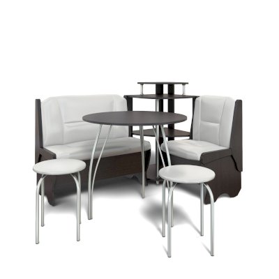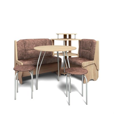 Оригинальный кухонный уголок Лотос отличается от других похожих кухонных гарнитуров. Он состоит из двух отдельных диванчиков и этажерки, заменяющей угловую мягкую часть. Круглый кухонный стол в отличие от других наборов мебели на металлическом основании как и два круглых табурета. Набор мебели для кухни включающий в себя большую прямую скамью,малую прямую скамью,угловую этажерку, стол на металлических ногах и два табурета на металлокаркасе. В прямых скамьях под сиденьями расположены ящики.