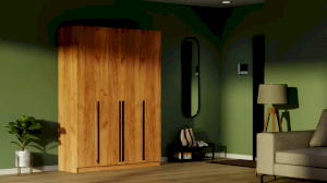 Четырехстворчатый шкаф имеет универсальный вариант для хранения: на боковых полках можно разместить нижнее белье, одежду, постельное белье, а на горизонтальной штанге развесить одежду на вешалках. Сочетание платяного и бельевого отсеков позволяет использовать шкаф в качестве комбинированного.
