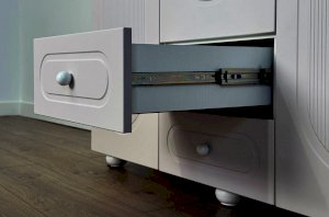 Корпус шкафа выполнен из ЛДСП толщиной 16 мм, фасады изготовлены из МДФ в плёнке ПВХ и декорированы фрезеровкой. Оригинальные круглые ручки и опоры подчёркивают стиль мебели и придают ей визуальную лёгкость.